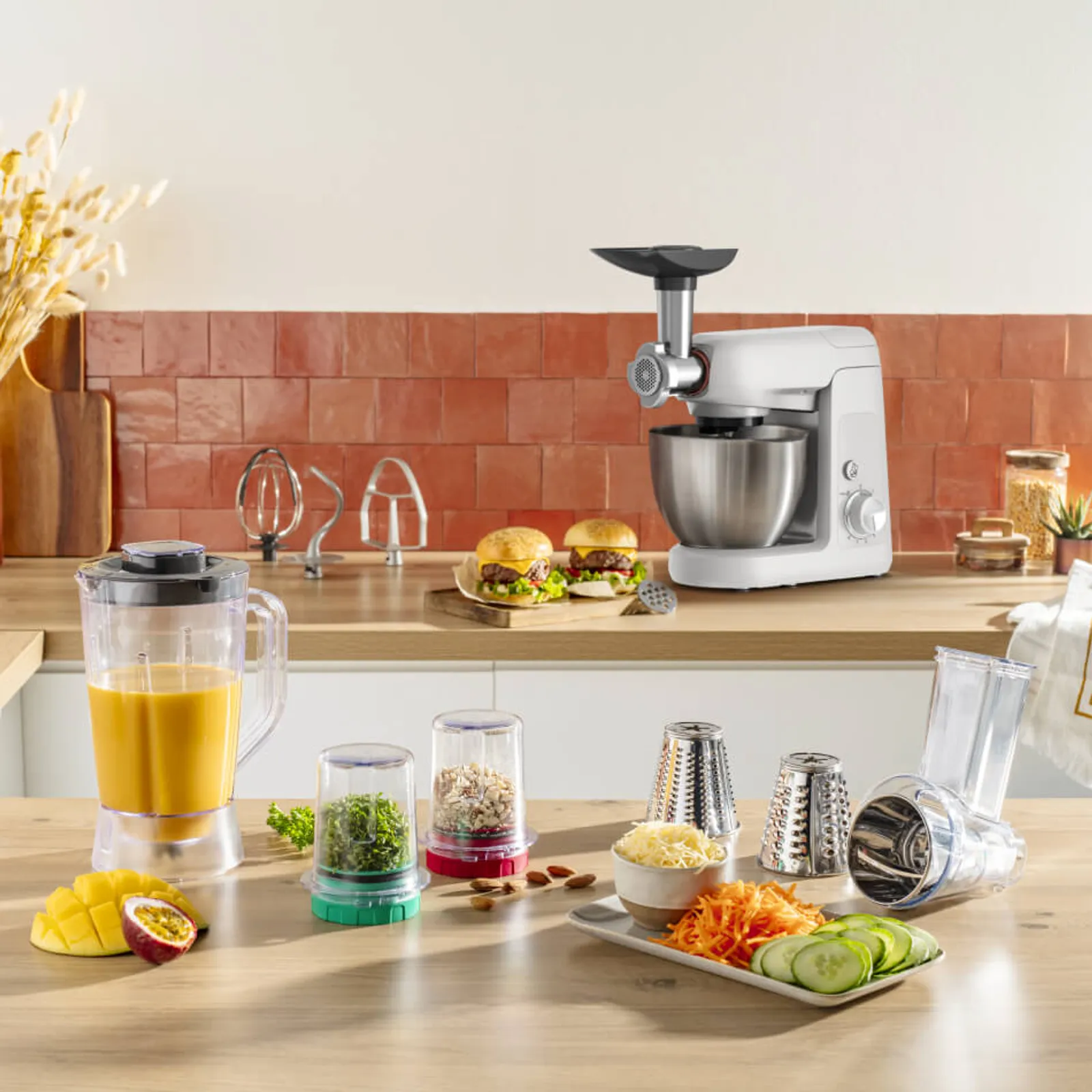 В комплект входят венчик Tel Flex, насадка для лёгкого теста, крюк для тяжёлого теста, блендер объёмом 1.25 L, мясорубка, тёрка/слайсер и мини-измельчитель. Такой набор расширяет функциональность и позволяет готовить разнообразные блюда.