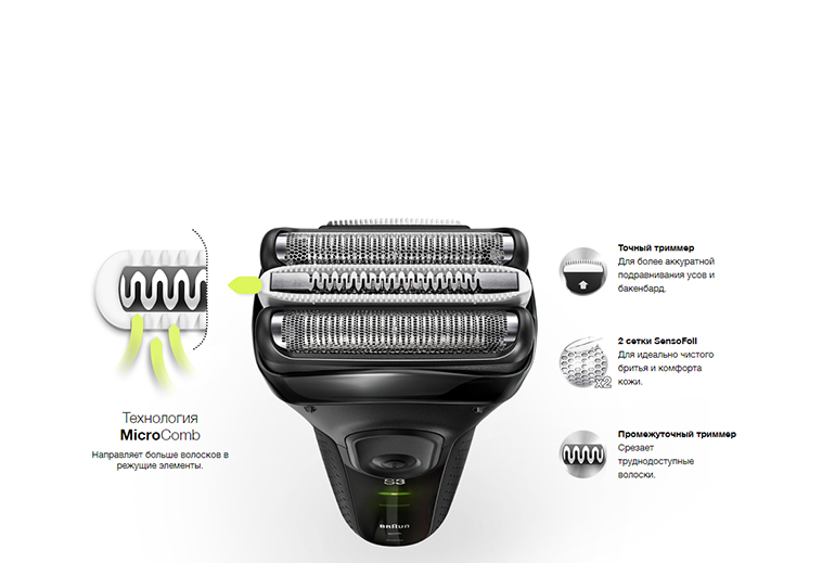 3 элемента бритвенной системы с независимой подвеской и технологией MicroComb для более эффективного и комфортного бритья.