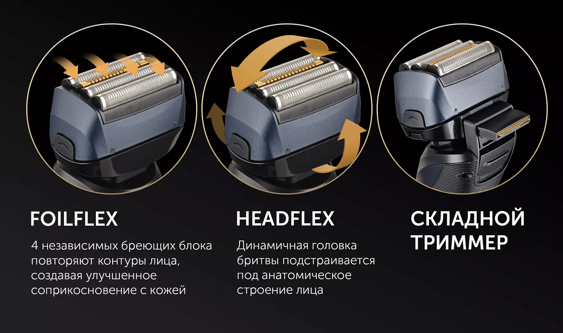 FoilFlex - 4 независимых бреющих блоков повторяют контуры лица, создавая улучшенное соприкосновение с кожей.