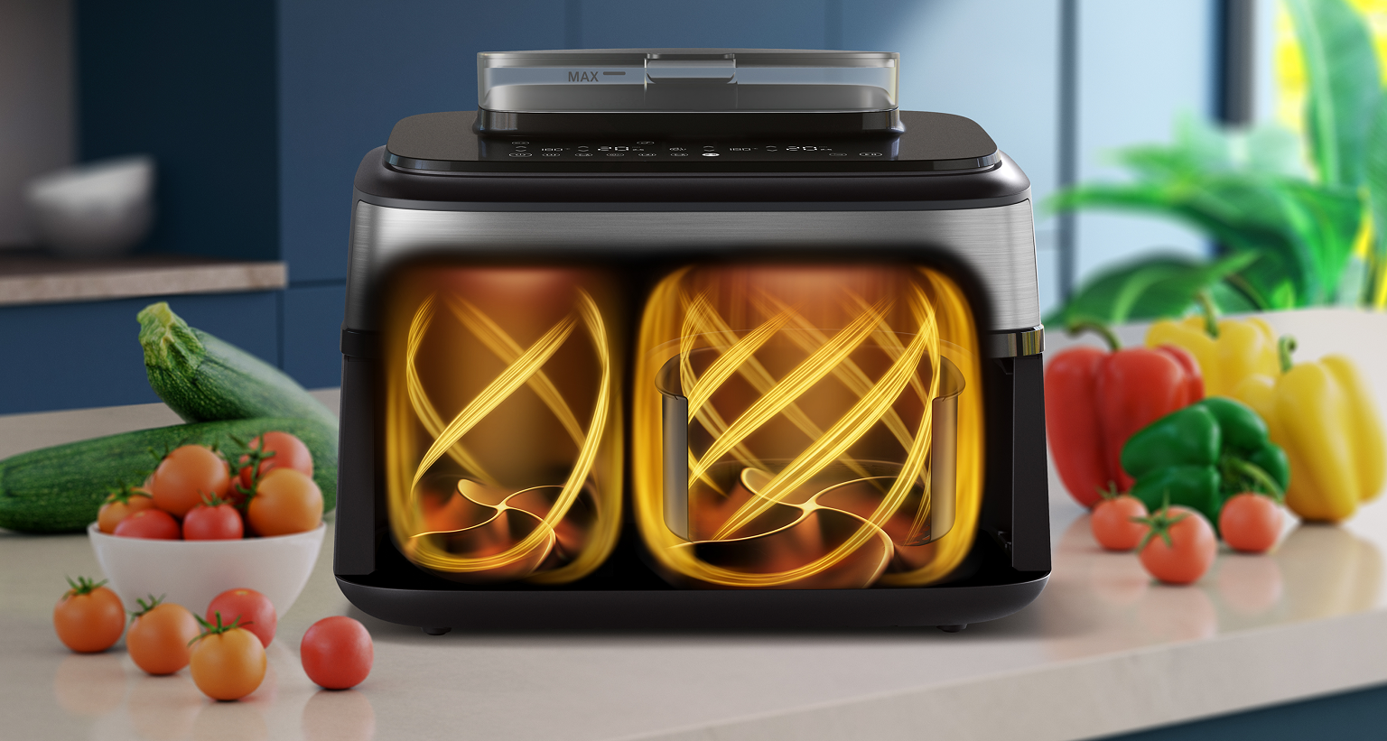 Устройство оснащено двумя корзинами: большая ёмкостью 6 л и маленькая 3 л. В них можно одновременно готовить основные блюда, гарниры и закуски. В большую корзину помещается целая курица весом до 1,2 кг, а также до 1100 г картофеля фри или 1600 г овощей. Функция одновременного приготовления синхронизирует время готовки в обеих корзинах, чтобы блюда были готовы одновременно.