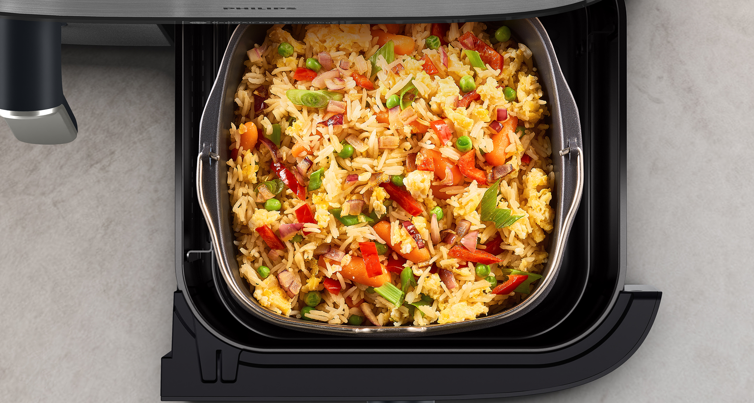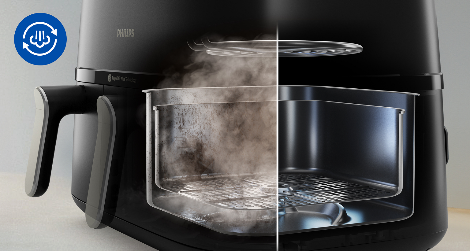 Аэрогриль Philips с двумя корзинами позволяет готовить различные ингредиенты одновременно тремя способами, выбирая оптимальный метод в зависимости от продукта. Технологии RapidAir Plus и Air Steam обеспечивают равномерное приготовление, создавая идеальную корочку и сохраняя до 90 % меньше жира¹. Благодаря готовке на пару ингредиенты сохраняют нежную текстуру и полезные вещества.